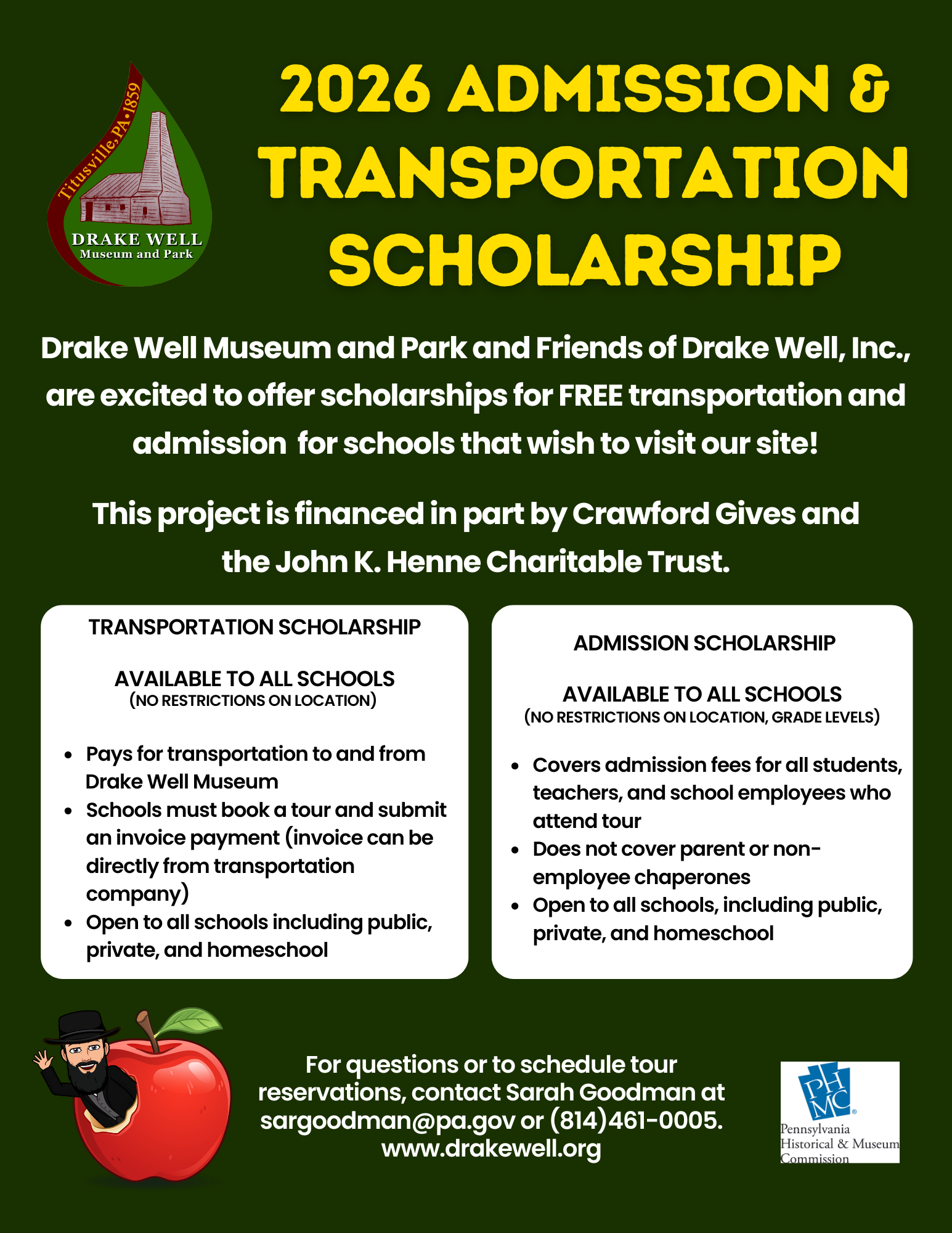 Guided tours of the grounds and gallery exhibits at Drake Well Museum are provided to groups of 10 or more visitors, including but not limited to adults participating in bus tours, senior, social, and church groups.